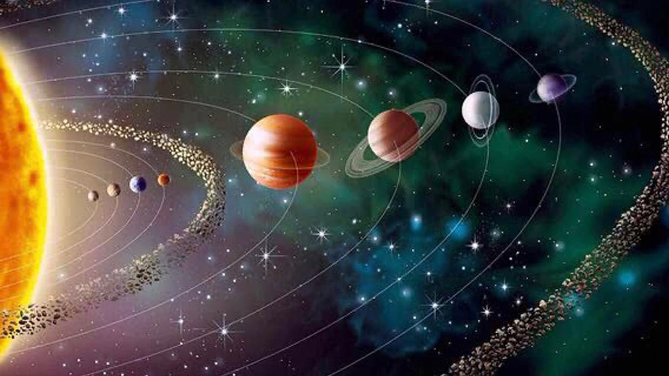 しかし、実際の宇宙から見た太陽系の姿は、太陽を中心に各天体が回転しながらそれぞれの軌道を描いて進んでいます。